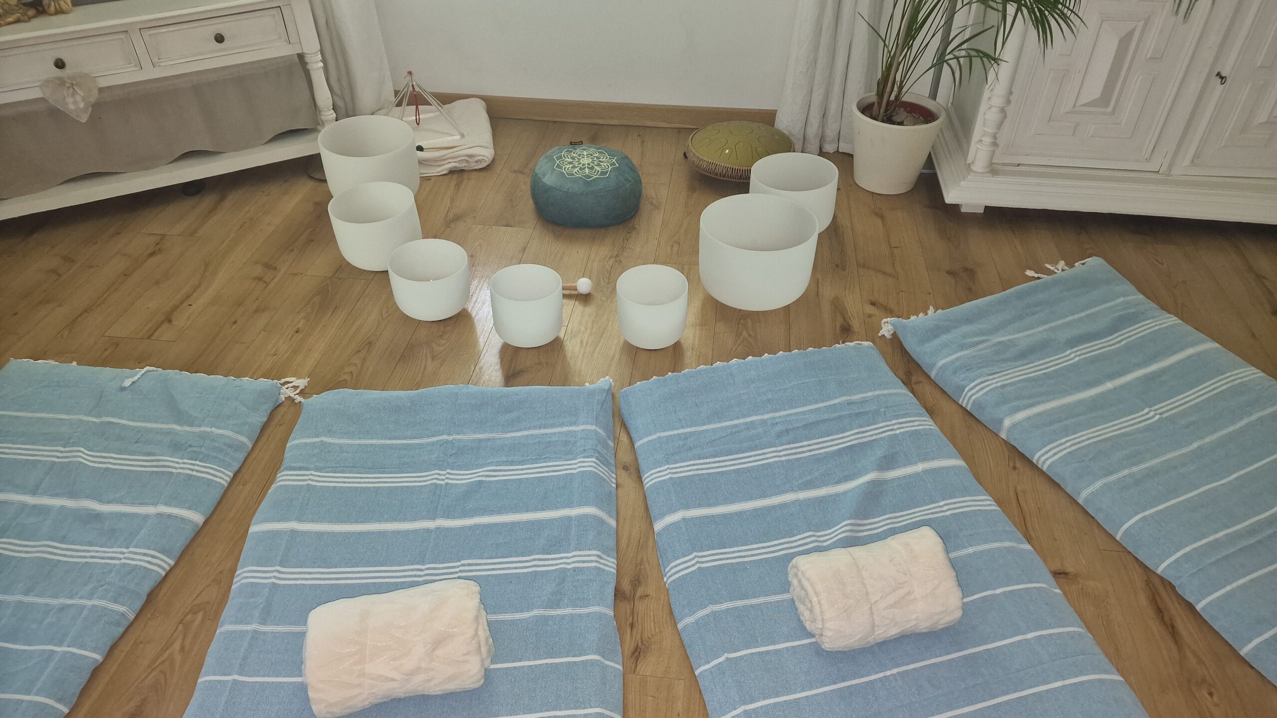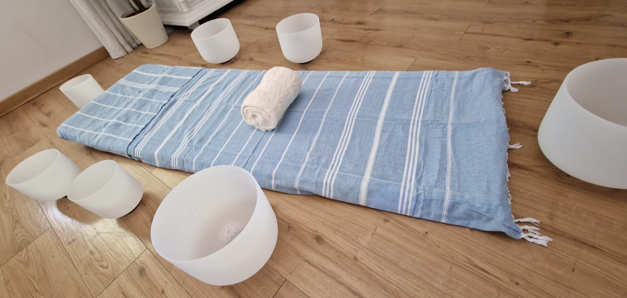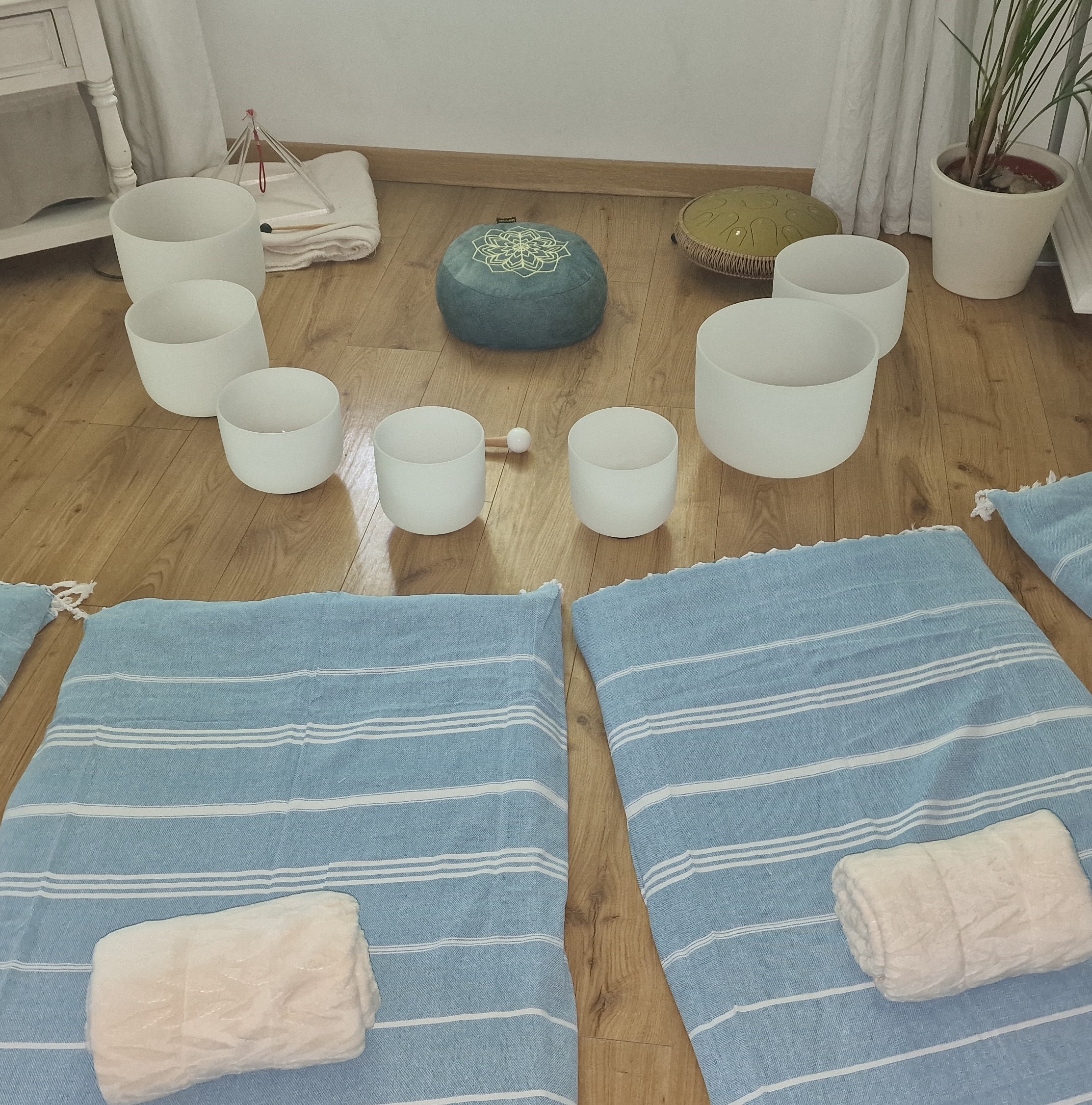 Le son pur et les fréquences et harmoniques précises des bols de cristal placés tout autour du corps, permettrons le travail vibratoire des fréquences cristallines.